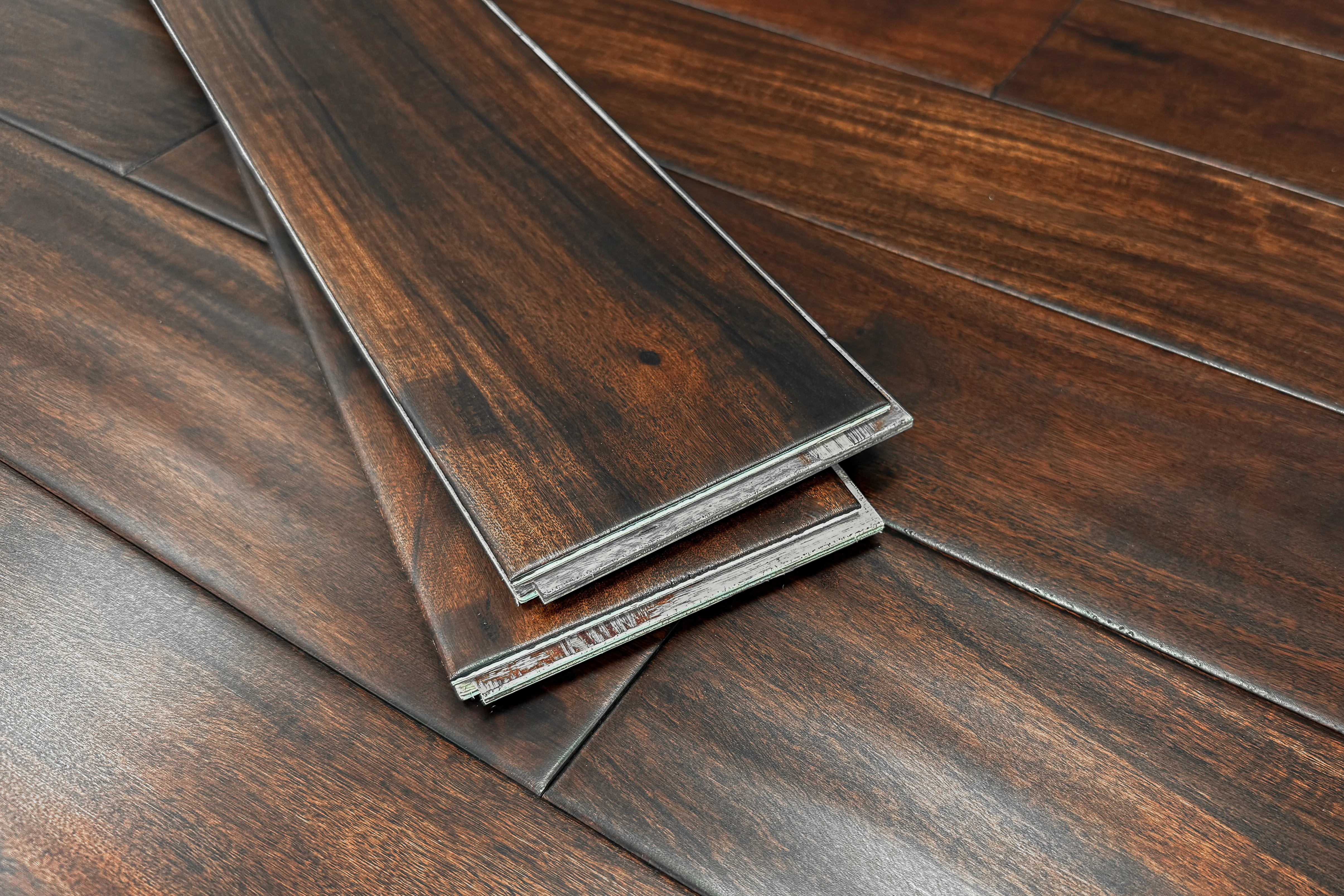 Engineered Acacia Dark Handscraped is a bold, high-contrast engineered hardwood that brings depth and drama to any space. Rich espresso and deep chocolate tones dominate each plank, accentuated by Acacia’s signature graining and natural variation. The handscraped finish adds rustic character and dimensional texture, making it a standout choice for traditional, modern rustic, or moody, design-forward interiors.