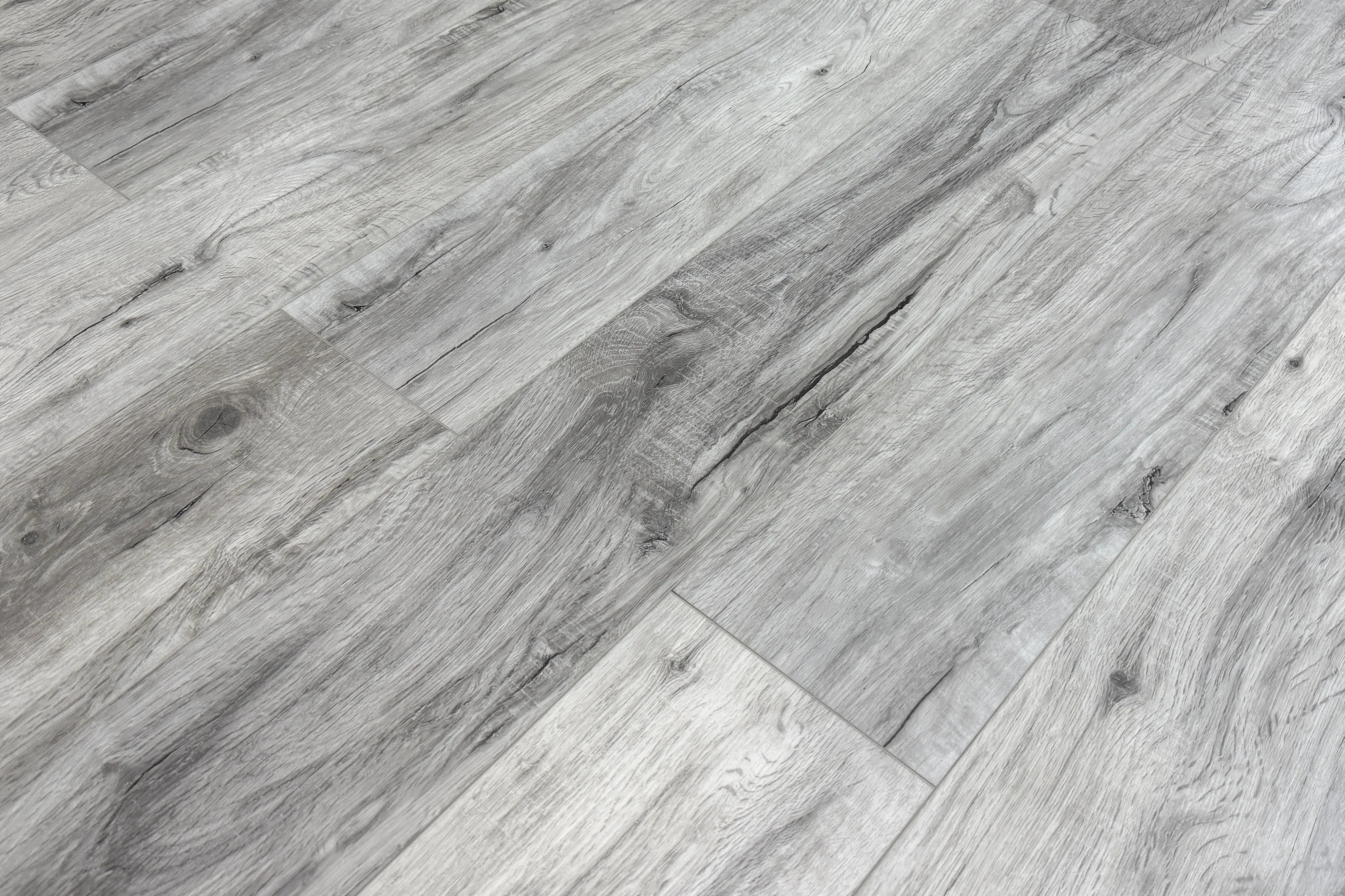 With its cool weathered grey tones and striking wood grain movement, this shade brings a modern, loft-inspired edge to any space. Soft layers of silver, ash, and subtle charcoal undertones highlight flowing cathedral patterns, natural knots, and authentic character markings. Each 7" x 60" plank captures the look of time-aged hardwood while maintaining a cohesive, balanced appearance across the floor — perfect for interiors that blend rustic texture with contemporary design.