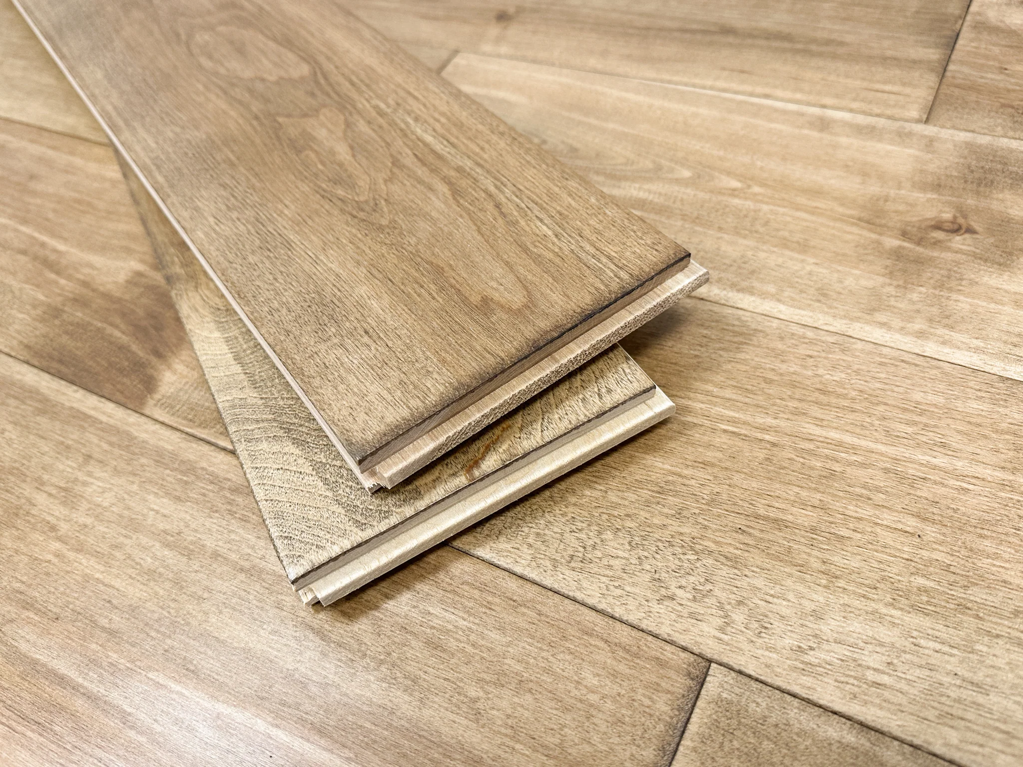 Crafted from solid Maple with a Janka Hardness Rating of 1450, each plank is kiln-dried for stability and finished with 10 coats of UV-cured lacquer for enhanced durability and scratch resistance. The surface is handscraped for added depth and authenticity.