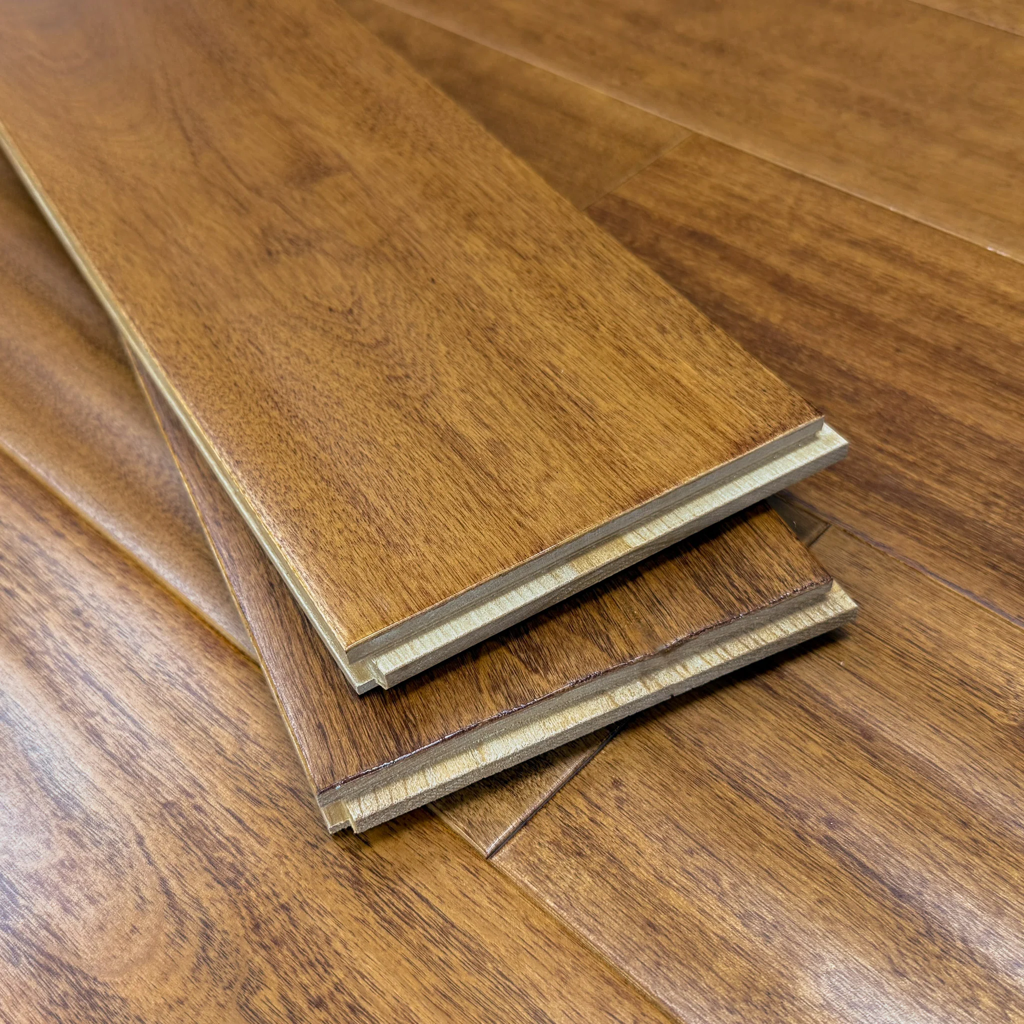 This floor highlights Maple’s naturally refined grain and warm tonal variation, enhanced by a handscraped surface texture and a semi-gloss finish that adds depth and a soft, polished sheen.