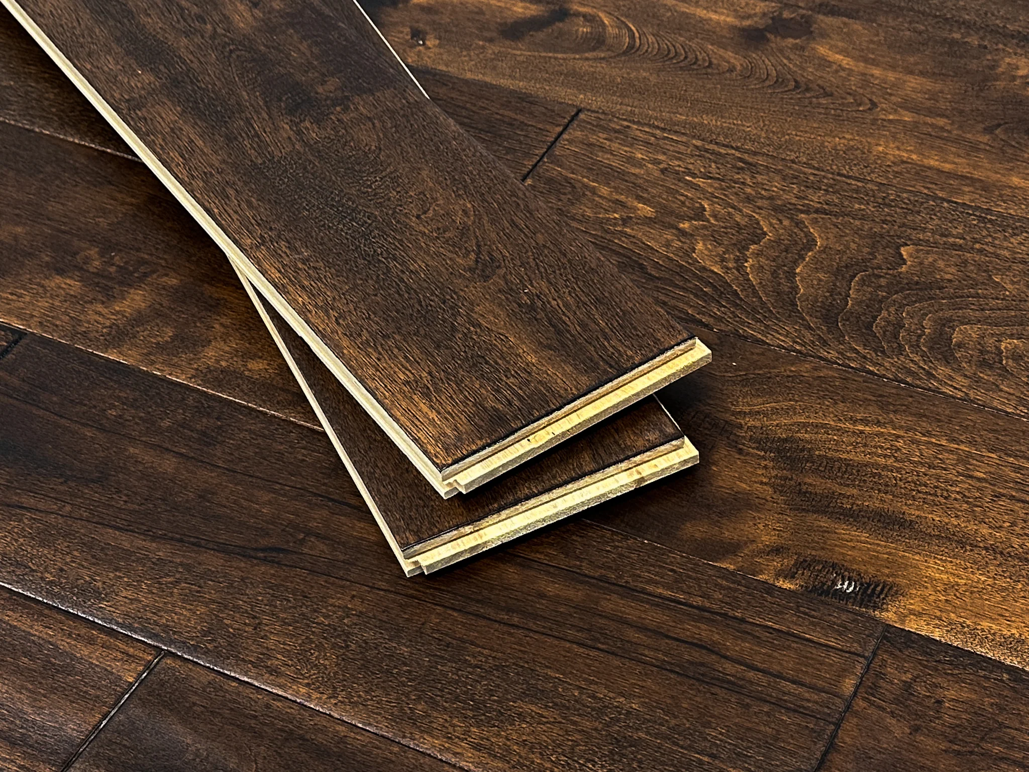 This floor highlights Maple’s refined grain and depth of tone, enhanced by a handscraped surface texture and a semi-gloss finish for a polished look.